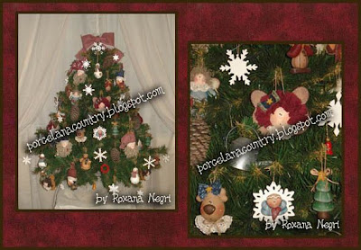 Realicé todos los adornos combinando porcelana fría, tela, madera y demás materiales rústicos, además, agregué piñas naturales y cacharritos minis de zinc... un árbol bien country!!!